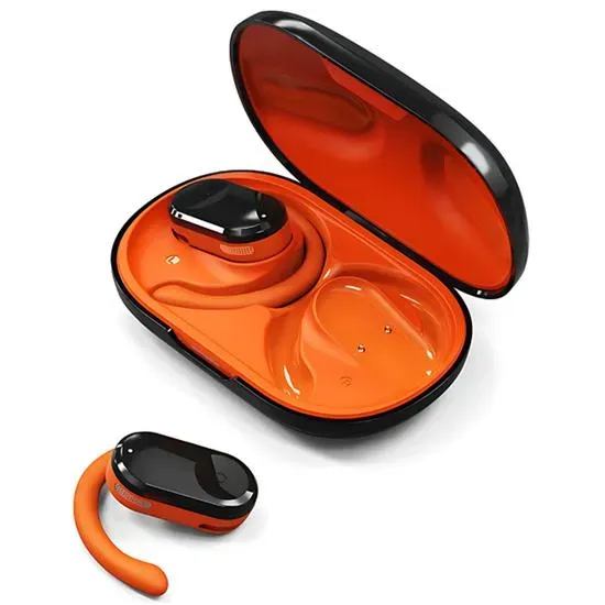 Un par de auriculares inalámbricos en un estuche naranja que te brindarán la libertad de disfrutar de tu música favorita sin enredos. Con un diseño moderno y compacto, estos auriculares son ideales para llevar a todas partes y disfrutar de un sonido de alta calidad.